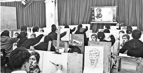 美术生们正在训练人像素描。