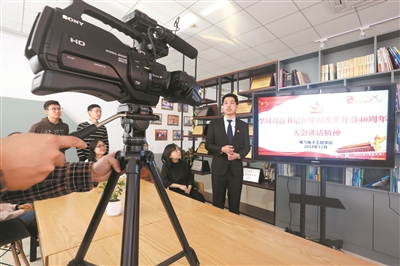12月19日,天津理工大学电气电子工程学院“思政MOOC翻转课堂”录制了学习习近平总书记在庆祝改革开放40周年大会重要讲话精神的专题视频,帮助学生学习大会精神。图为该学院研究生在录制课程。本报记者 陈欣然 摄