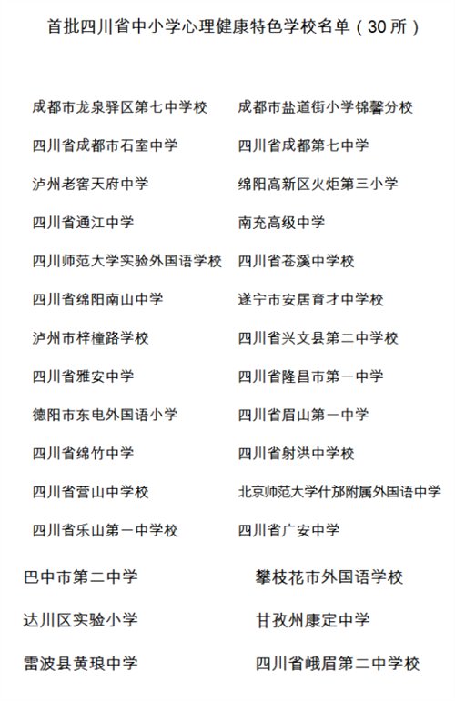 人民网成都1月18日电 (任重)据四川省教育厅官微消息,近日,四川省教育厅组织开展了首批四川省中小学心理健康教育特色学校创建工作。在市(州)教育行政部门初审和推荐基础上,经专家评审,共计30所学校为首批“四川省中小学心理健康教育特色学校”。