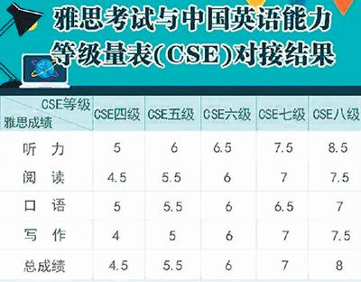 雅思总成绩6分,相当于中国英语能力等级(CSE)六级。日前,随着雅思、普思考试与中国英语能力等级量表对接研究结果的公布,雅思、普思考试成绩有了对应的中国英语能力等级。