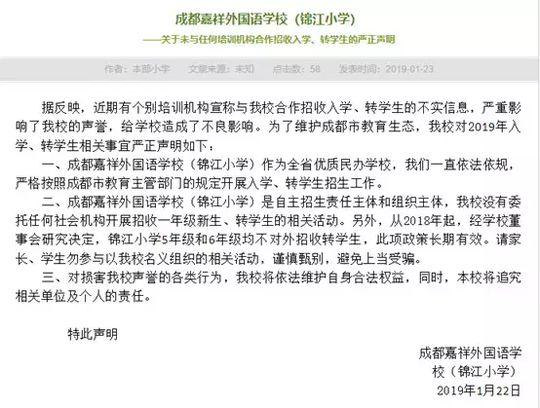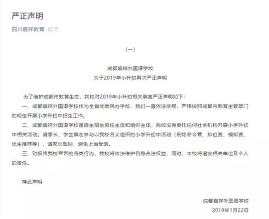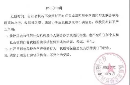近日,成都嘉祥外国语学校、西川中学、天府四中、四川师大附属第一实验中学等中小学校纷纷在自己的官网或官微上发表严正声明,郑重声明自己学校从未自行或委托、变相委托个人、社会机构举办以选拔生源为目的的考试、考核、培训、比赛、营地活动等。不允许、不默许任何个人或社会机构打着为学校组织生源的旗号而组织任何形式的培训、考试、招生。