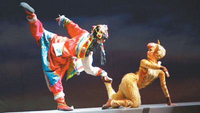 少儿京剧不仅是京剧,更是儿童剧,要考虑儿童的观赏需求。因此,《藏羚羊》并未严格遵守京剧象征性极强的程式化表达,而采用了实体布景和道具。服饰夸张活泼,富有卡通意味,从中又能看出京剧传统扮相的影子,比如公羚羊的长角,戴在演员头上,俨然像是短一号的雉毛翎;扮演雪狼的演员全身衣白,脸上也涂着类似奸臣的“白脸”,既是模拟雪狼这种动物的毛色,又用京剧语言暗示出其性格的奸诈狡猾。剧目着重突出“唱念做打”中的“打”,用精彩热闹的武戏来吸引儿童的兴趣,表演藏羚羊的演员们在舞台上经常会连续翻一长串跟头,其中不乏高难度的空翻,完美展现了藏羚羊轻灵矫健的身姿,每次都引起一片喝彩。