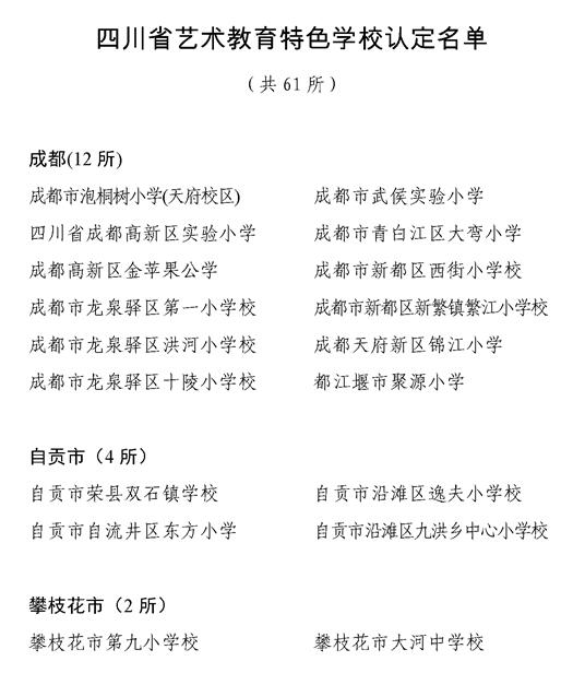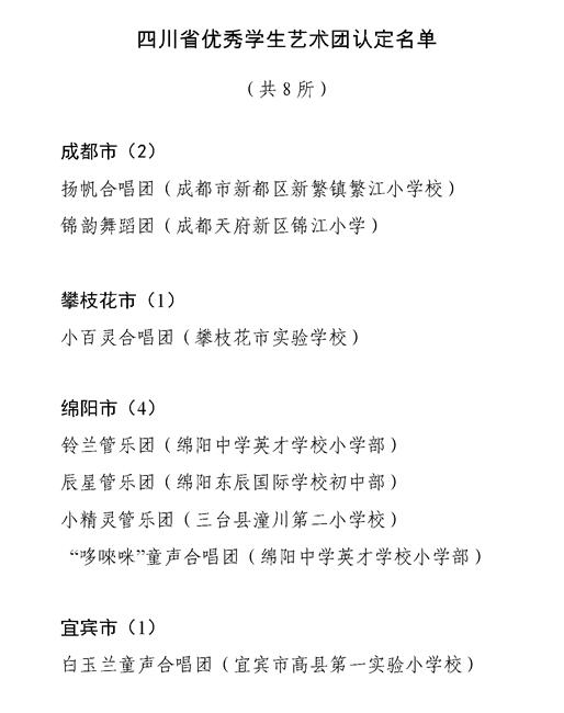 此次共认定61所省级艺术教育特色学校、8所个优秀学生艺术团、2个优秀传统文化艺术传承学校、1个中小学美育实践基地。其中,成都市共创建四川省艺术教育特色学校12所,四川省优秀学生艺术团2个。
