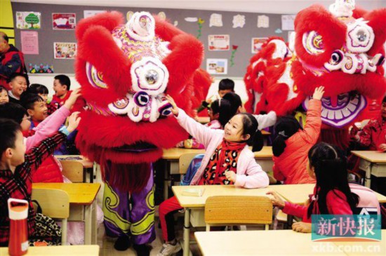 ■醒狮走入建设大马路小学教室和学生们互动。