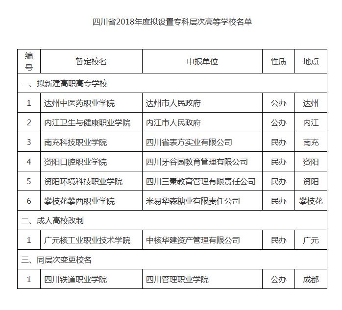 人民网成都2月20日电 (任重)据四川省教育厅官网消息,根据《中华人民共和国高等教育法》《民办教育促进法》《普通高等学校设置暂行条例》(国发﹝1986﹞108号)和《教育部关于“十三五”时期高等学校设置工作的意见》(教发〔2017〕3号)有关规定,经四川省高等学校设置评议委员会五届六次会议评议,并经教育厅党组研究,现将拟设置的专科层次高等学校进行公示。名单如下:
