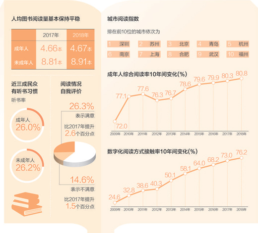 数据显示,2018年我国成年人包括书报刊和数字出版物在内的各种媒介的综合阅读率为80.8%,较2017年的80.3%有所提升,数字化阅读方式(网络在线阅读、手机阅读、电子阅读器阅读、平板电脑阅读等)的接触率为76.2%,较2017年的73.0%上升了3.2个百分点。图书阅读率为59.0%,与2017年基本持平;报纸阅读率为35.1%,较2017年下降了2.5个百分点;期刊阅读率为23.4%,较2017年下降了1.9个百分点。数字化阅读的发展,提升了民众的综合阅读率和数字化阅读方式接触率,整体阅读人群持续增加,但也带来了纸质阅读率增长放缓的新趋势。
