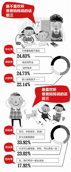 “这道题讲了这么多次,你都还不会?”“你看看你们班上的同学,人家好乖。”“没做完这个,不准出去玩……”这一幕幕,你有没有觉得似曾相识?日前,四川省眉山市东坡小学在全校三到六年级的学生中,进行了一场关于“我和爸爸妈妈聊聊天”的问卷调查,共收到3942份有效问卷,问题包括“你最喜欢/最不喜欢爸爸妈妈说的哪些话?”问卷调查结果显示,“今天可以看电视、手机,可以多玩一会”不出意料进入孩子最喜欢听的话前三甲。
