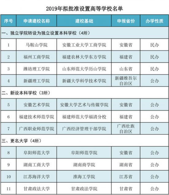 人民网北京5月24日电(李依环 褚昕岚)据教育部网站消息,教育部发展规划司23日正式公示了2019年拟批准设置高等学校名单。根据《高等教育法》《普通高等学校设置暂行条例》和《普通本科学校设置暂行规定》等有关规定,经第七届全国高等学校设置评议委员会专家考察和评议,11所由省级人民政府申报设置的高等学校获得通过,现将有关高校名单向社会公示。