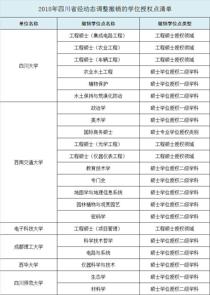 人民网成都5月27日电 (任重)据教育部官网消息,5月24日,国务院学位委员会正式公布了2018年动态调整撤销和增列的学位授权点名单。