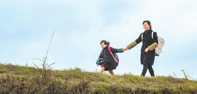 除了教孩子们学好功课,黄先群还承担起照顾孩子们的职责。图为她接上同路的孩子,一起去学校。 |