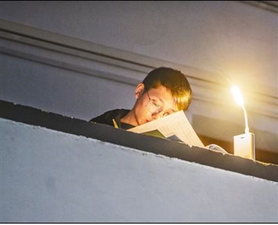 一名学生在走廊台灯下专注地学习。