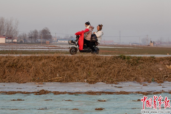 12月13日,大名县营镇乡赵庄村,志愿者教师庞欣冉(左)带着同乡同事骑电单车回20公里外的家。