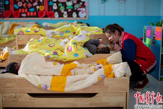 12月10日,大名县大街镇第一幼儿园,志愿者教师杜雯晴哄孩子午睡。近几年,县里30余所乡村幼儿园按照标准化配备升级,达到了城区办园条件。