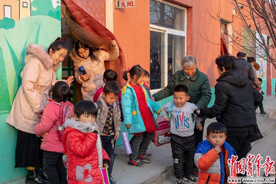 12月13日,大名县营镇乡赵庄村幼儿园,家长到教室外接孩子们回家。