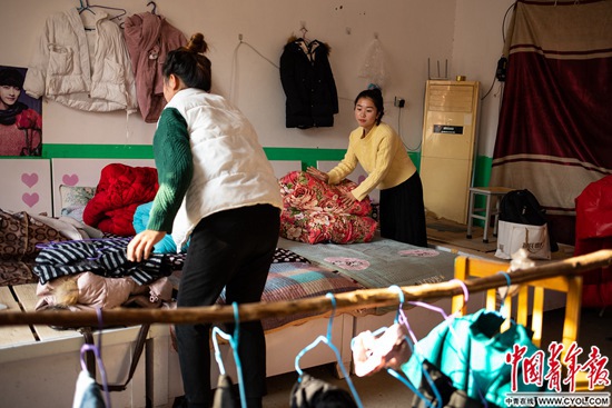 12月13日,大名县营镇乡赵庄村幼儿园,两名住校的志愿者教师打扫房间。