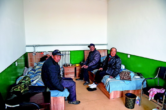 几个老人正聚在一起聊天,他们现在住的房间是用梁家坪一贯制学校的办公室改造的。