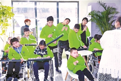 每个孩子的脸蛋都红扑扑的,要进场了,“绿衣服”分散开来,有人喊,“一起来拍张合影吧”。15个孩子,重新聚拢。有9个坐在轮椅上。