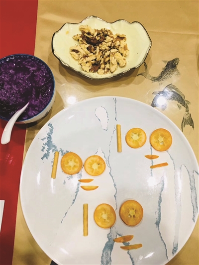 一位妈妈为迎考的孩子做花样早餐:水墨白瓷盘里用薯条加两个圆圆的橙片拼成三个100分,一碗紫米粥、一碟核桃仁,这样美丽的画面是象征语数外都要考100分吗?