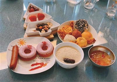 有位妈妈用面包条拼成一个“优”,周围环绕了一圈猕猴桃。还有的妈妈用一根香肠加两个荷包蛋,象征100分。更有创意的妈妈用香肠加两个甜甜圈,下面还用番茄酱画出两道杠杠,装水果和坚果的小碟子拼成了一棵圣诞树……妈妈们脑洞大开,创意十足。