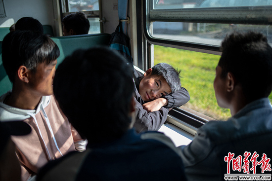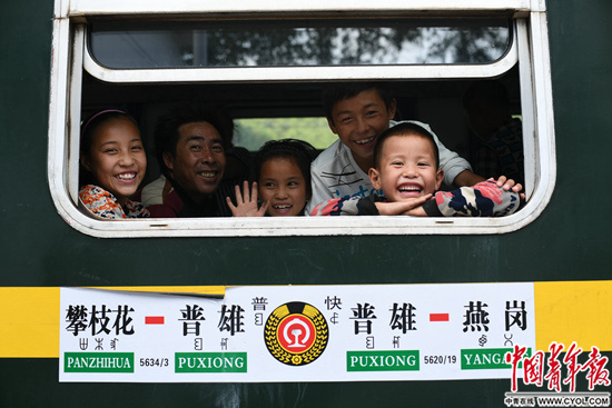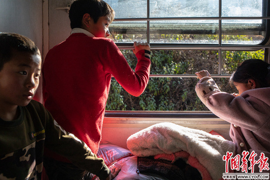 1月10日,由攀枝花开往普雄的5634次列车上,放寒假回家的孩子们趴在车窗上看风景。慢火车将这些求学的孩子一批又一批地送出了大山,又在这举家团聚的时刻护送他们踏上回家的路。