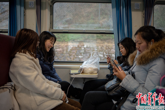1月11日,5633次列车上,正在玩手机和看剧的4名年轻人。她们其中有3人是放寒假回家的老师。
