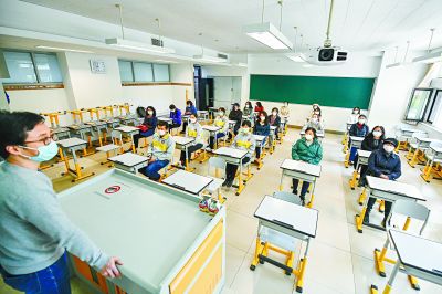 一边是仍处于突发公共卫生事件一级响应机制的现状,需尽量避免人流交叉;一边是新高考带来的选课“走班”模式,一所学校不同学生的选课组合最多可达20多种。两头兼顾,各校出妙招。延庆区第一中学校长陶汪来说,每个班均分成A、B两班,固定座位,确保一人一桌,利用智能黑板,实现实时同步互动教学。二中每层十余间教室,4间是行政班教室,其余都是“走班”教室。该校校长薛丽霞说,大部分学生入校不需串层。十二中则为一生配“两室”——上午时段,学生在行政班教室完成语数外主干课程;下午时段,学生根据自己的选考科目在走班教室进行学习或自主答疑。