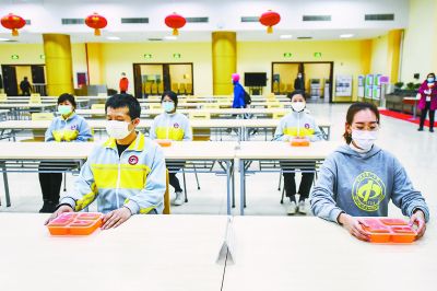 二中食堂内座位重新布局,就餐学生保持距离,单向就坐。