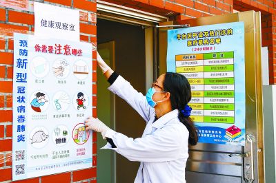 北京十二中的校医在健康观察室张贴防疫海报,将为特殊情况人员提供隔离场所。