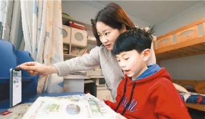 近日,贵州省铜仁市玉屏侗族自治县皂角坪街道紫林苑小区居民黄平芳在家里引导孩子通过网络学习英语。 |