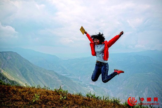 今年高考理科644分的会泽县考生范天兰,拿着通知书开心得蹦起来。(9月8日摄)本报记者江文耀摄