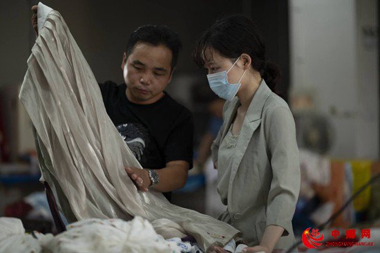 图为刘童童(右)在汉服工厂内研究汉服布料设计、制作细节。受访者供图