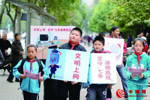 小学生宣传“拒绝‘祖安文化’,提倡文明上网”。 资料图片