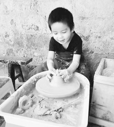 游客小朋友在明月村体验陶土拉胚。记者郑海鸥摄