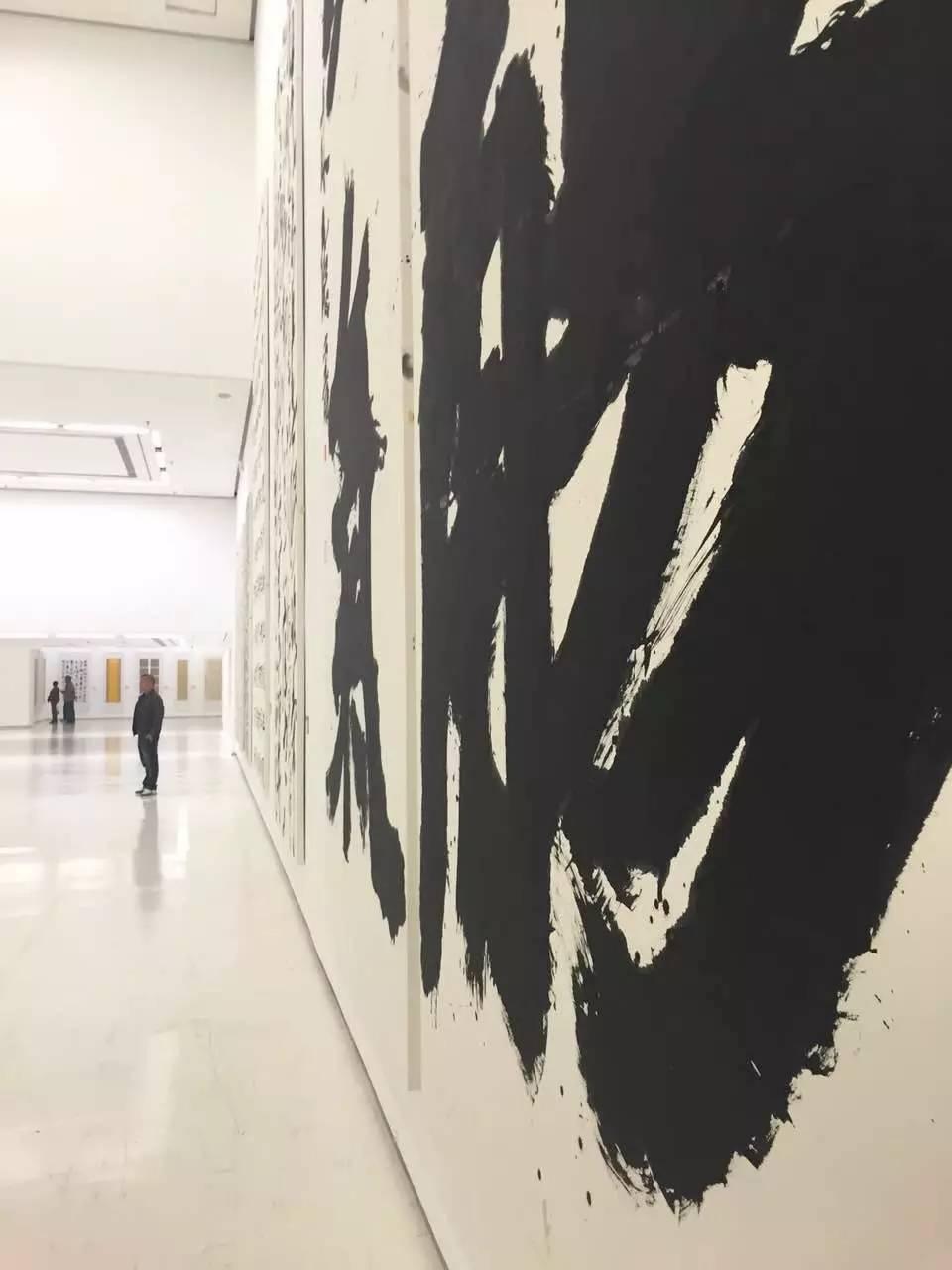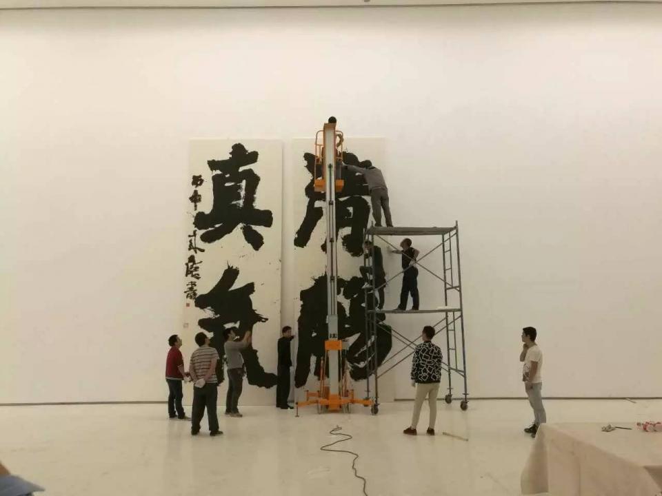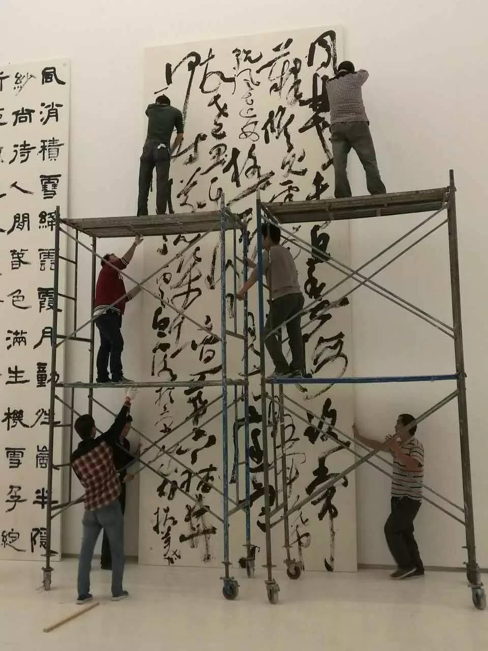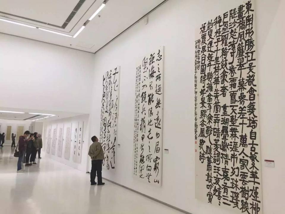 西安美术学院副院长张英群介绍道,此次展览的特点有以下几个方面:首先是规格高。参展作者中不仅有沈鹏、欧阳中石等当代书坛公认的大家,也包括中青年骨干创作力量。参展书家在精心创作、挥洒艺术才情的同时,也展现了各自独特的艺术风格和成就。第二,巨幅作品是亮点。西安美术馆的二层展厅的核心空间格局高达九米,展方特邀八位书家进行巨幅书写创作,部分作品达六米之高,可谓鸿篇巨制,为创作者带来了很大的挑战。但受邀书家却应对自如,根据个人创作经验和方向,将不同书体加以施展,使观众窥见如此巨制,看到当代书法艺术创作的多样性。第三,装裱格式有门道。此次展览统一采用裱板裱装方式,旨在让观众得以更好地领略书法艺术创作的魅力。