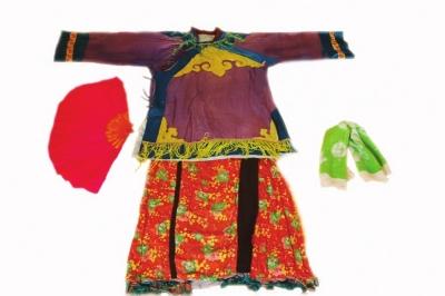 称“凉壳子”,顶尖上有一撮红缨,跳耍时红缨随把式舞“凤凰三点头”的舞步动作左右摇摆。“凉壳子”做工有讲究,多由百姓自制。把式服与旦角服风格独具:把式穿长袍,上身套大襟棉袄,颜色多为大红、天蓝和粉红色。上年纪的把式还佩戴各种髯口。旦角服装主要特征为;上身穿棉袄,下身穿花裙,脑后有发髻,额头戴“昭君带”,两鬓插蝴蝶式黄纸花,年轻旦角还可梳长辫子。由于制作颇具工艺且有很多讲究,所以把式服与旦角服也由百姓购买布料自己加工裁剪。把式舞表演的道具是草扇、毛巾、纸扇、纱巾等。其演出程式一般分为:“踩台”“开门帘”“打小唱”“演故事”。其中“演故事”是高山戏的正式内容,其他打麦场地的表演如“圆庄”“上庙”“走印”等,则带有明显的祈福、娱神性质。