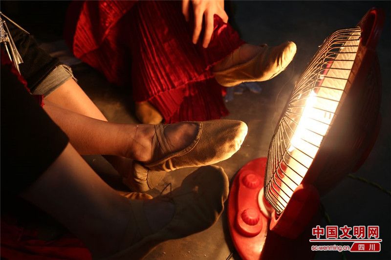 此次文化列车慰问演出期间,大部分时间都在下雨,很多演员常常要表演好几个节目,在湿冷的舞台上演出结束后,演员们回到休息室,抓紧时间烤干脚上的舞鞋,又要准备投入到下一个节目中。