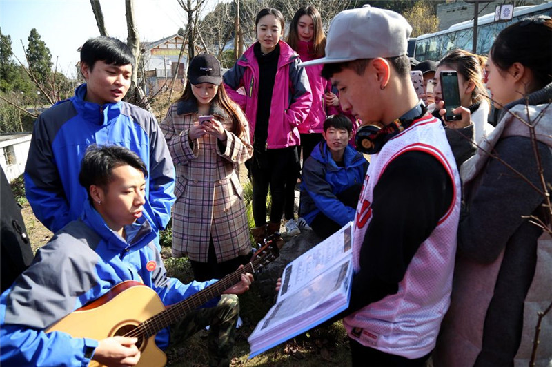 在本届文化列车中,有一群舞蹈演员,还是大学校园内的学生,这次是他们第一次参加文化下乡慰问演出。虽然一路颠簸,他们依然用最温暖的方式为大家洗去满身的疲惫。图为12月26日,最后一场演出结束后,客车停在路边休息,演员们拿出吉他唱起了《老男孩》。