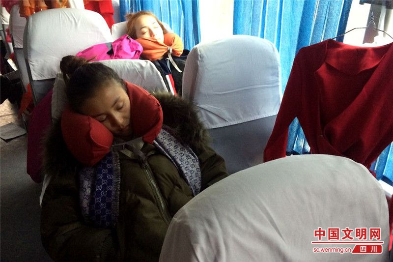 演出的路途总是颠簸和遥远,8天中,几乎演员们每天都奔波在路上,为了保证到了现场能够以百倍的精神投入到演出中,演员们会在利用路途中的时间补充睡眠。图为12月26日早晨,演出队在赶往南江县长赤镇的路上,四川省川剧研究院的演员卓玛在车上休息。