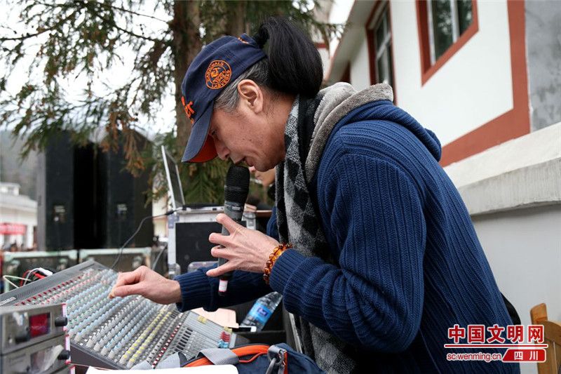 音响师付恒总是最早来到演出现场的人,演员们演出前的每一首音乐、每一个耳麦,都需要他一一调试,确保演出顺利进行。至于一共参加了多少届文化列车,付恒也不记得了。图为12月25日,在南江县小田村演出现场,当天气温接近0℃。