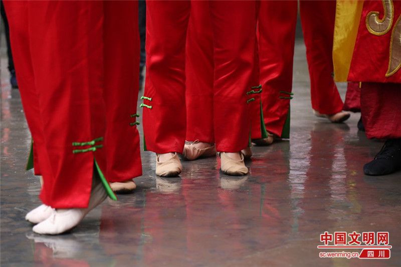 演出中,不管天气如何变化,穿着单薄演出服和薄底舞鞋的演员们都要以最美的姿态站在站在舞台上,即便是下雨天。图为12月24日,演员们站在湿冷的地上候场。