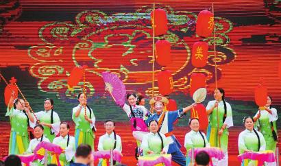 9月14日,芦山县庆祝首届“中国农民丰收节”暨猕猴桃绿色生态农产品推介活动在龙门镇隆重开幕。图为当地群众表演非物质文化遗产《芦山花灯》。 本报记者衡昌辉摄