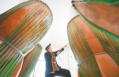 烟墩大鼓非遗传承人黄平修在表演后摆放大鼓。