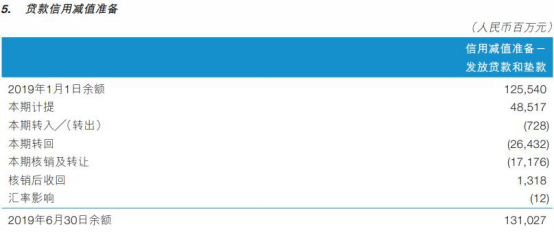 截至2019年6月末,交通银行贷款信用减值准备为1310.27亿元。其中,本期核销及转让171.76亿元。