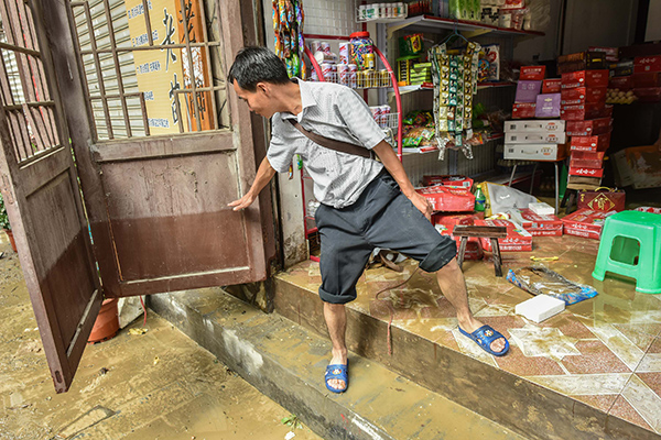 5月27日,雷山县城内一居民在介绍洪水最高时淹没的位置。