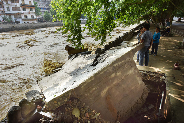 洪水将雷山县城内的一座桥梁被冲毁(5月27日摄)。