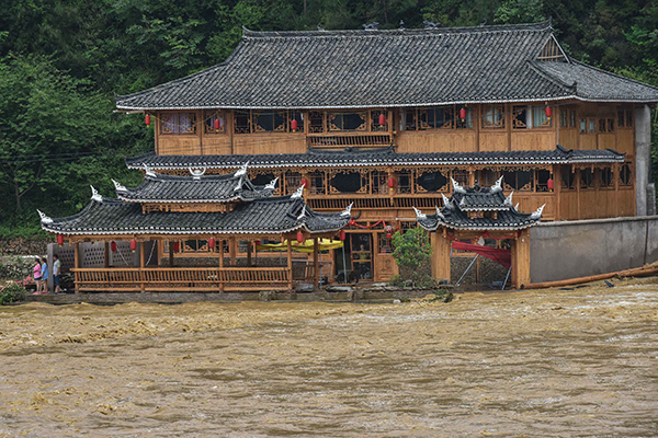 5月27日,洪水将雷山县城内的一处民房围困。