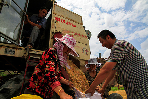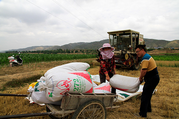 6月26日,在甘肃省庆阳市环县环城镇五里屯村,农民搬运收割机收下的麦子。