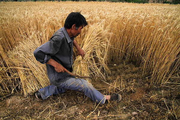 6月26日,在甘肃省庆阳市环县曲子镇张塬村,农民孙志忠在收割麦子。