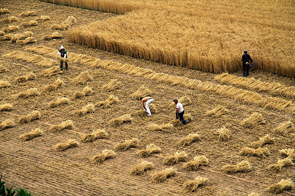 6月26日,甘肃省庆阳市环县环城镇张滩滩村农民在田间收割麦子。