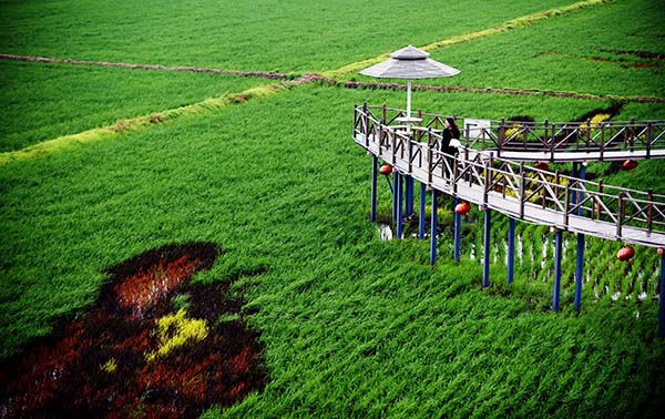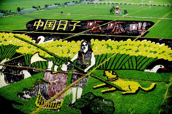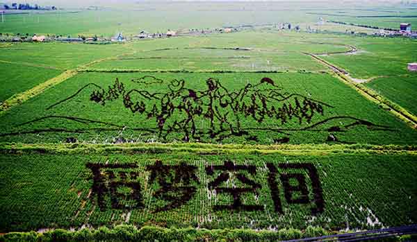 当日,总占地面积150亩的巨幅稻田画亮相沈阳市沈北新区兴隆台锡伯族镇锡伯龙地农业产业园。据介绍,这些稻田画包括《中国梦 幸福起航》《中国日子 呱呱叫》《小梦露》等13幅图案,由9种颜色的彩色水稻组成。稻田画将创意农业与休闲旅游相结合,为都市人们休闲观光提供了新去处。